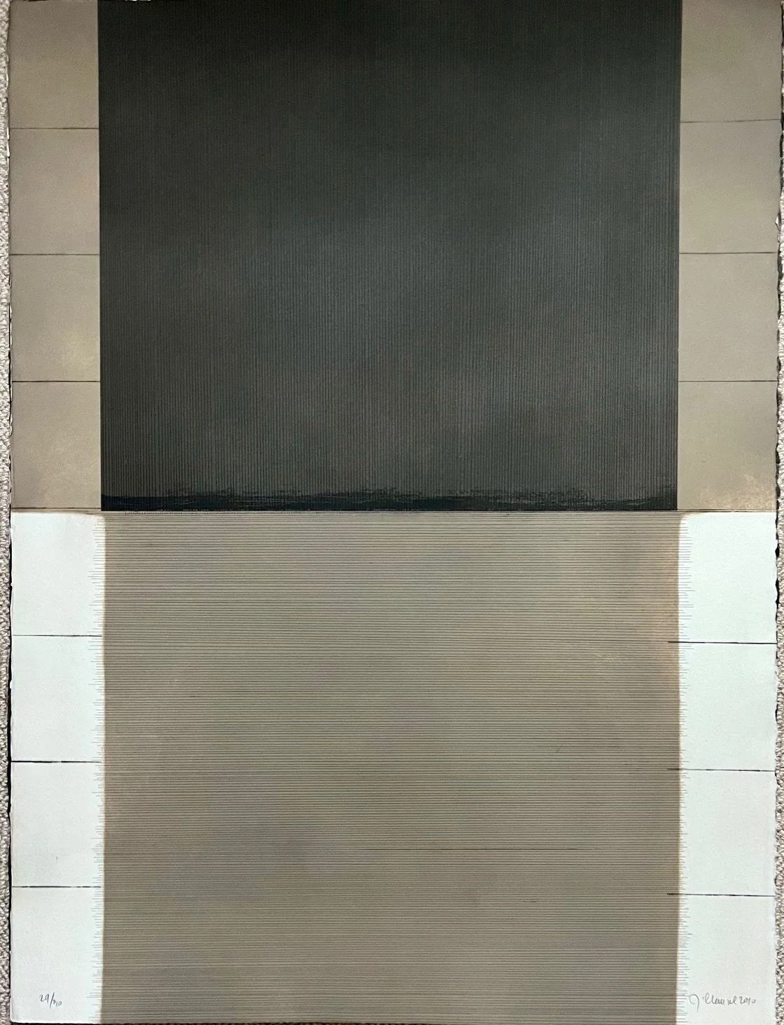 Intimately woven together with his pictorial research, engraving is, for Clauzel, an astonishing area for experiment, "a new and indispensable element", "a base for taking things further". With a tremendous appetite, he explores line by piling on and combining techniques, before diverting and reinventing them. A period of extensive research focusing on papers (crumpled paper, torn and pasted, large papers mounted on canvas, works on kraft paper). In 1983, Jacques Clauzel bought a printing press to print his first etchings and produced his first printings. In the middle of the eighties, the essential themes which identify his artwork are present in all the works. A limited edition available from France.